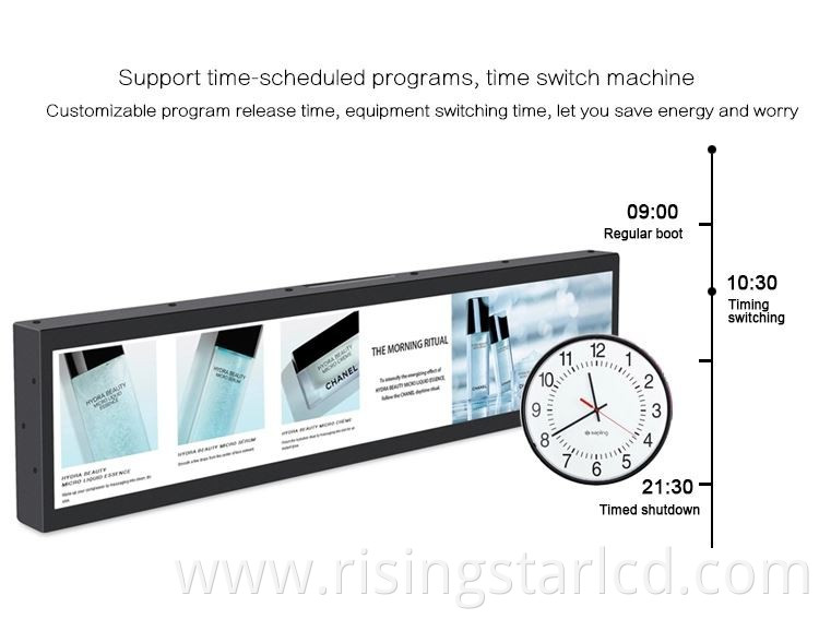 *Bar LCD advertising display built-in industrial power, low energy consumption, high level of safety protection, with power failure protection and short circuit protection.